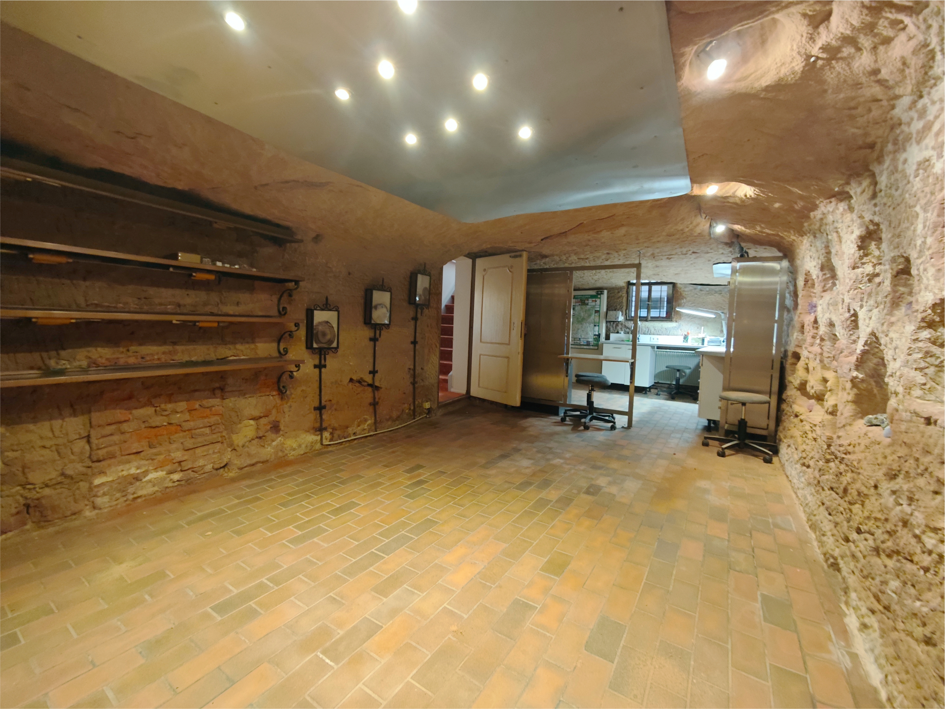 Die ca. 134m² Fläche verteilen sich auf den großen Hauptraum, einen in den Homburger Schlossberg eingelassenen Showroom der auch als Werkstatt oder Lagerraum genutzt werden kann und die jeweils im ersten und zweiten Obergeschoss durch eine Treppe erreichbaren Personal-/Besprechungsräume.
