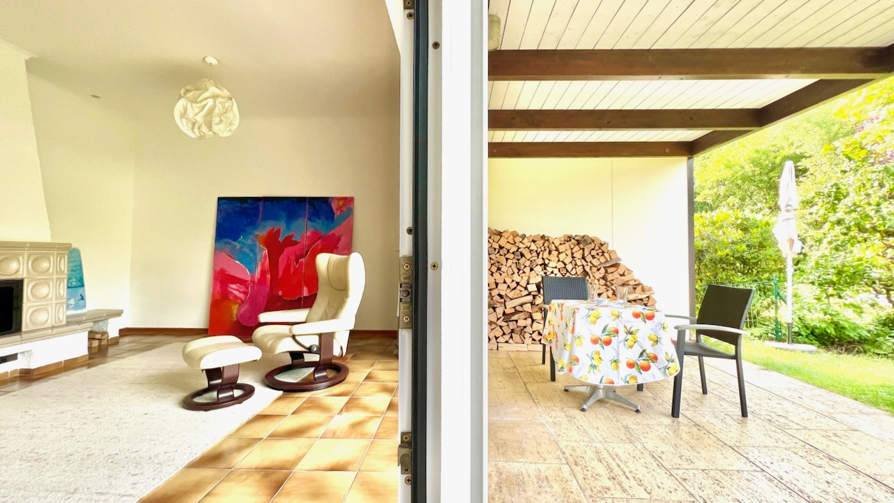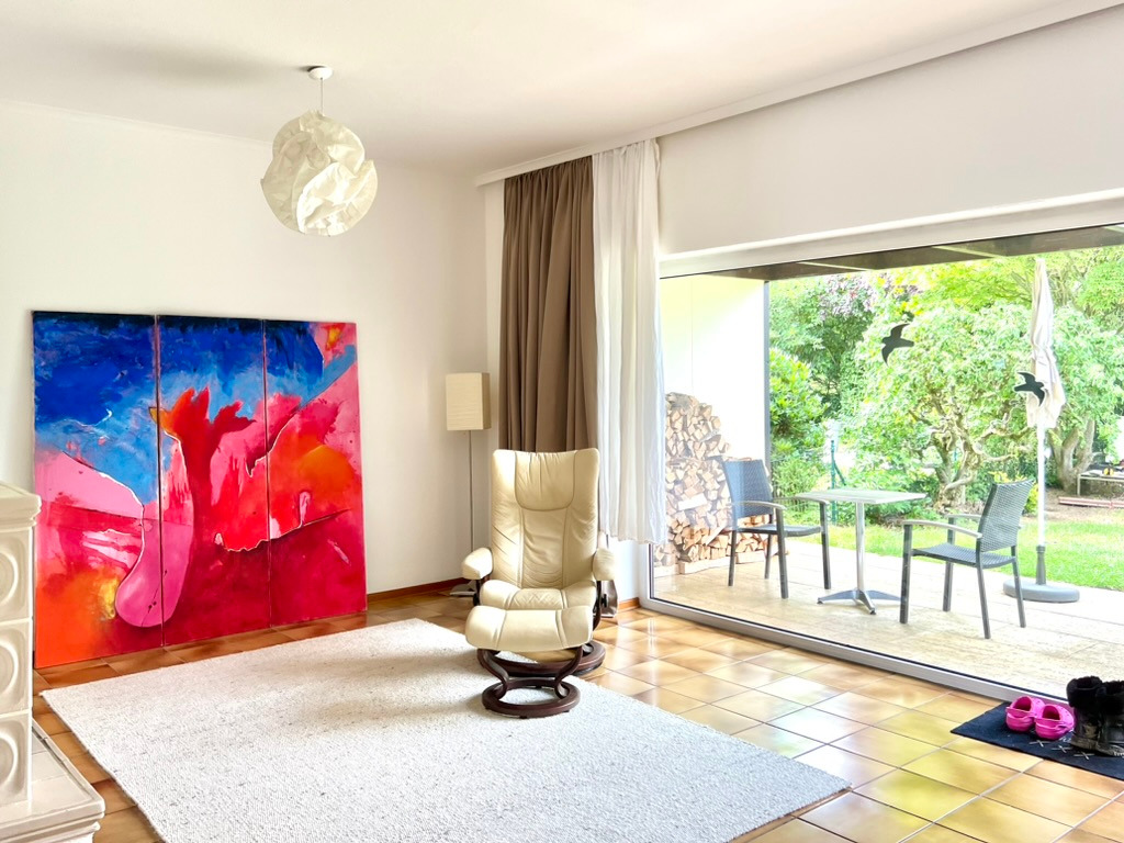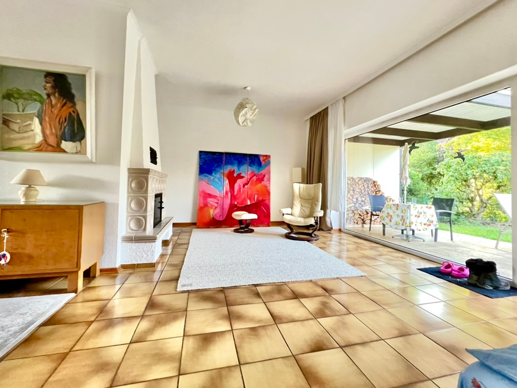 – optisch abgesetzer Wohnbereich mit Kamin und Zugang zur Terrasse sowie dem schön angelegten Garten